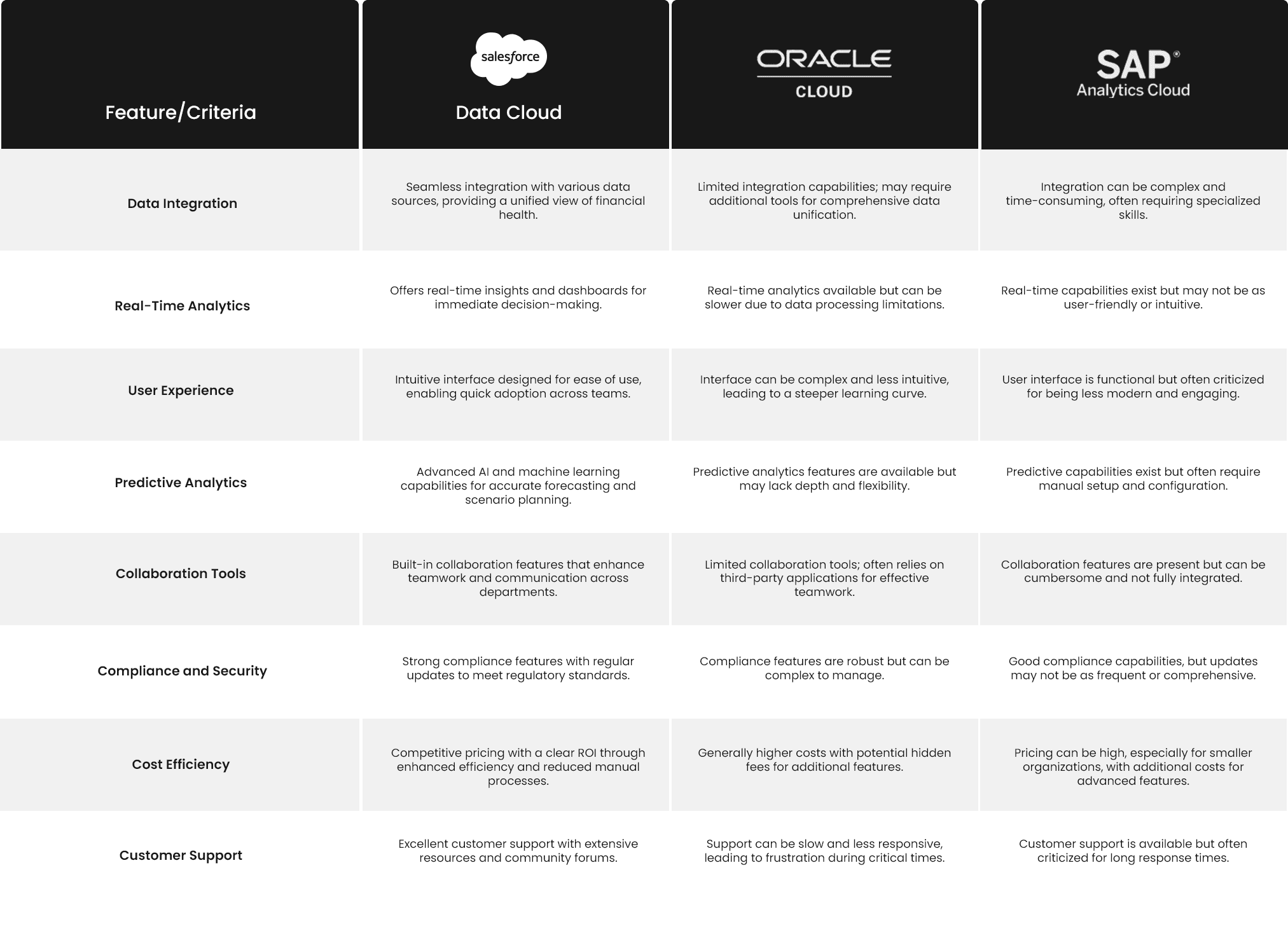 Get startedSalesforce Data Cloud enables collaborative budgeting by integrating data from different departments, providing a comprehensive view of financial performance. This integration allows CFOs to identify areas for cost savings and allocate resources more effectively, leading to more accurate and strategic budgeting.