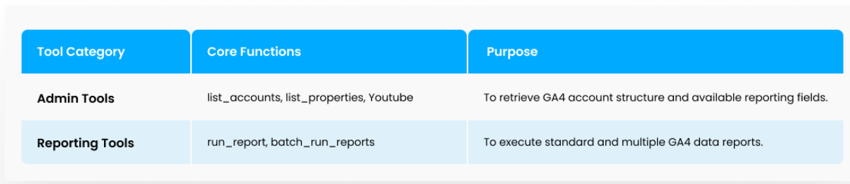 The agent’s intelligence is made actionable through specialized Function Tools (or components) written in Python12, which directly interact with the Google Analytics API: