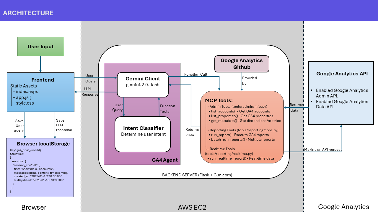 This agent ensures secure and scalable data retrieval, directly integrating with two critical Google Analytics APIs: