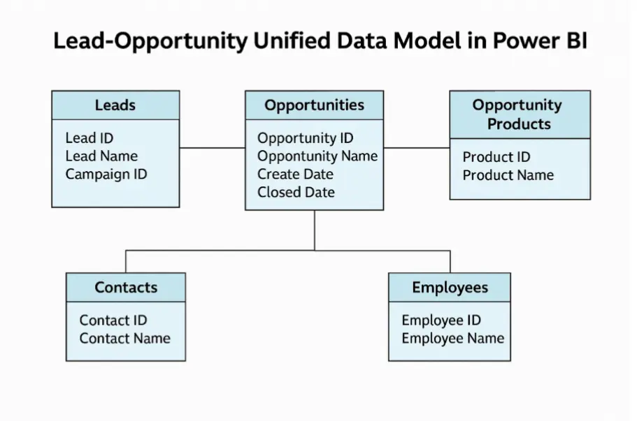 The existing Market link data model lacked an integrated view connecting Leads, Opportunities, Opportunity Products, and the Contact and Employee information associated with both. This fragmented structure made it difficult to perform complete pipeline analysis, evaluate sales touches, or connect lead and opportunity lifecycles in a consistent manner.