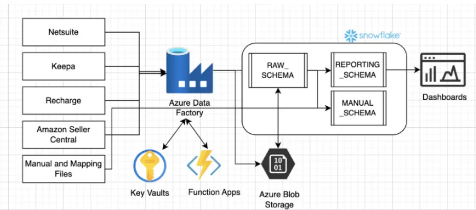 The client grappled with inconsistent reporting, a lack of a centralized data warehouse, and sluggish query performance. Their data was scattered across multiple platforms such as Netsuite, Amazon Seller Central, Keepa, Recharge, and Shopify. This fragmentation led to incorrect data and challenges with ad-hoc reporting. The primary objective was to integrate data from these diverse sources to support daily reporting needs and ad-hoc analyses, as well as to incorporate additional data sources for business growth.